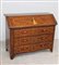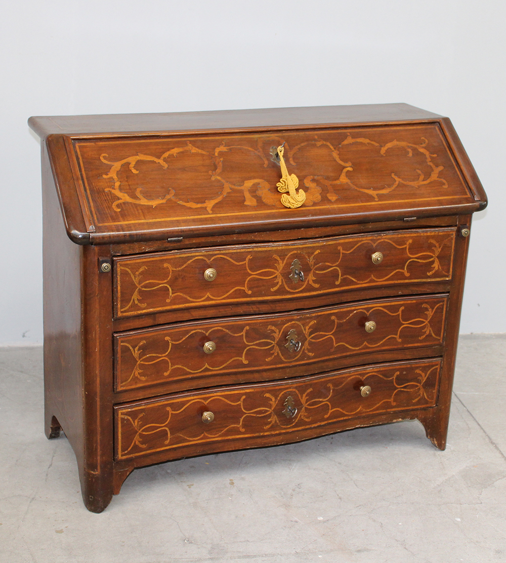 Ribalta piemontese in noce con fronte mossa a tre cassetti decorata con intarsi a volute e filettature, calatoia celante quattro cassetti e vano a giorni. Secolo XVIII (cm 123x100x52) (difetti e restauri)