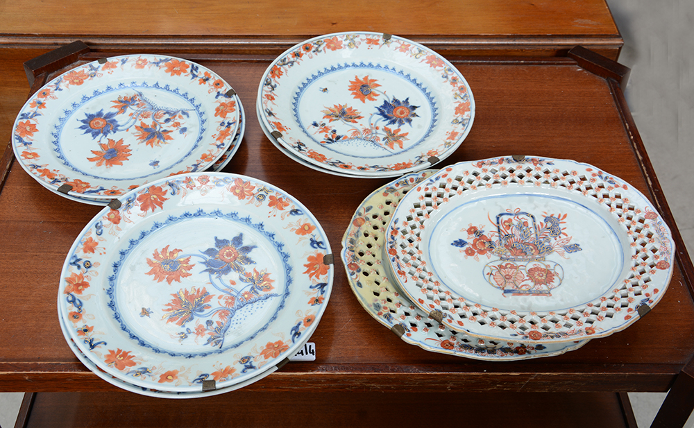 Sei piatti circolari Imari e due piatti ovali Imari con bordo reticolato....