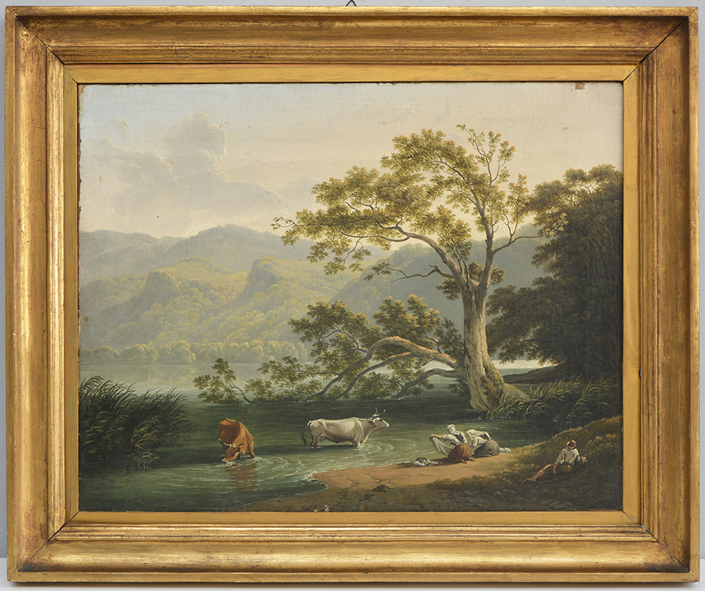 Scuola europea degli inizi del secolo XIX Paesaggio fluviale con lavandaie e armenti olio su tela cm 52x66 in cornice (difetti)