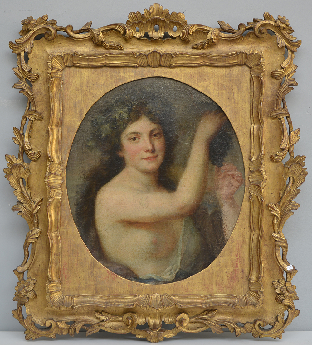 Scuola del secolo XVIII "Baccante" olio su tela (cm 61x50) in cornice in legno intagliato e dorato (difetti e restauri)