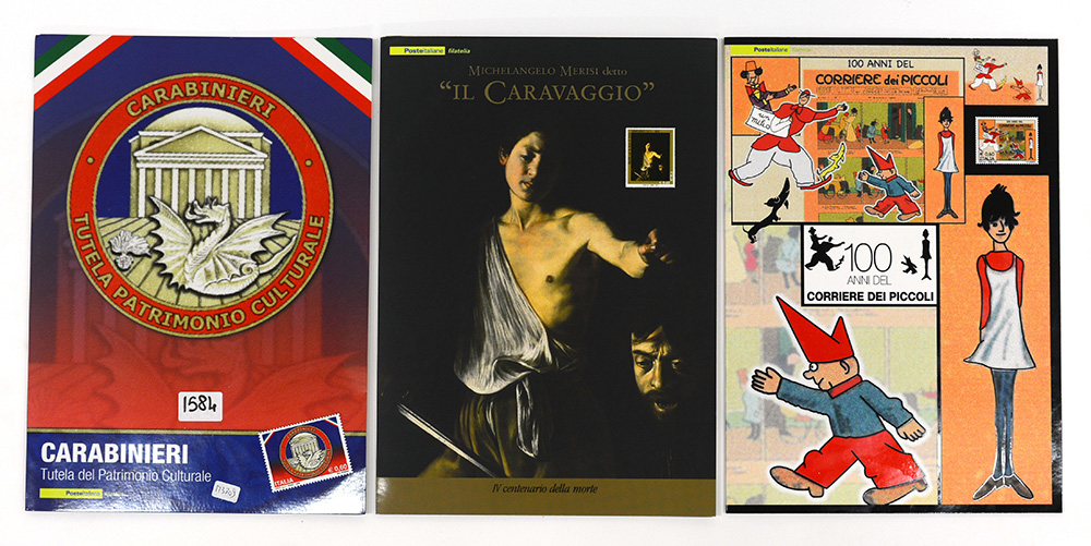 Lotto composto da tre folder contenenti francobolli celebrativi del Corriere dei Piccoli, Carabinieri e Caravaggio. Poste Italiane-Filatelia