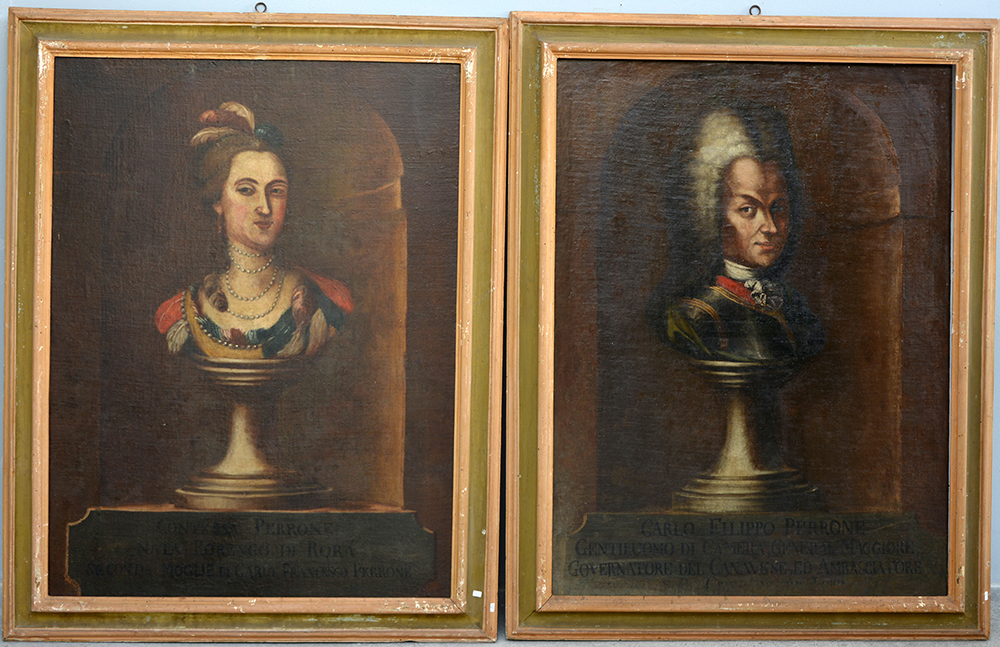 Ignoto del secolo XVIII, "Ritratti di gentiluomo e gentildonna della famiglia Perrone" coppia di dipinti ad olio su tela (cm 103x76) in cornici (difetti e restauri)