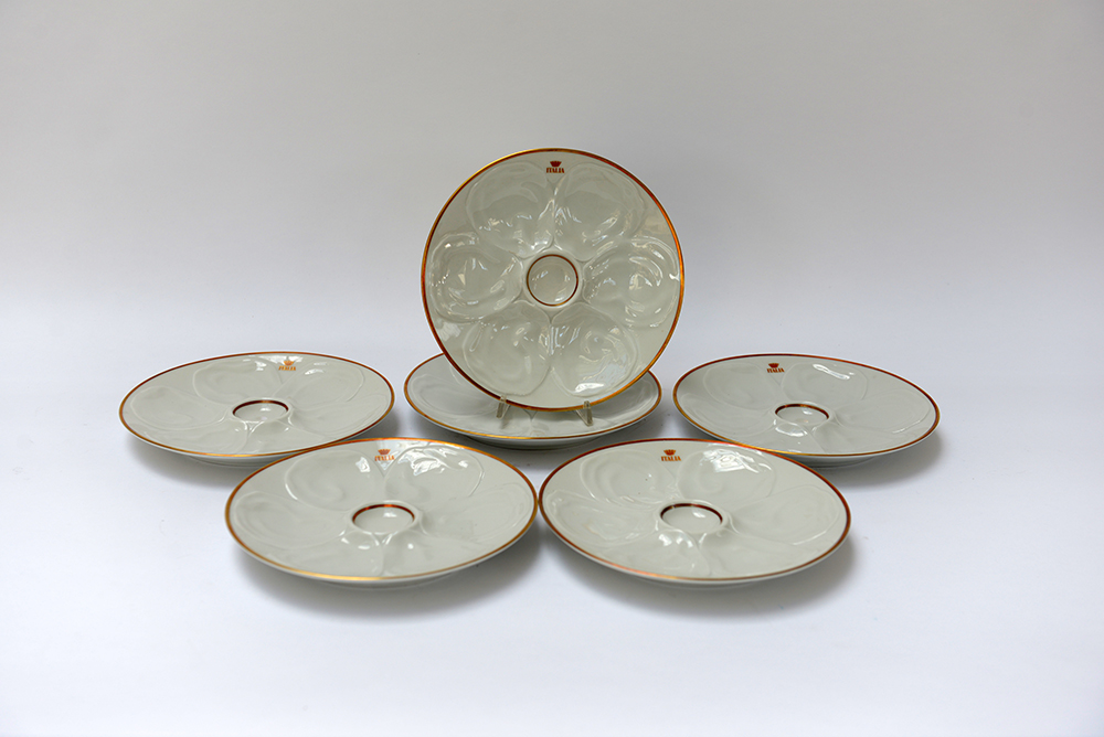 Gruppo di sei piatti per ostriche in porcellana con profili dorati (lievi difetti)