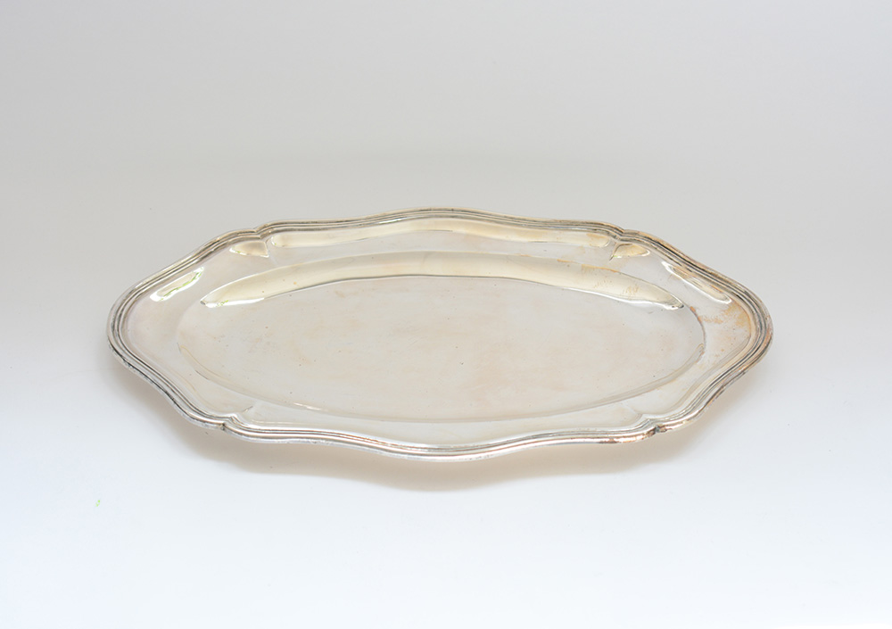 Vassoio in argento di forma ovale sagomata con bordura modanata. Asti, metà secolo XX (d cm 47) (g 1120 ca.) (difetti)