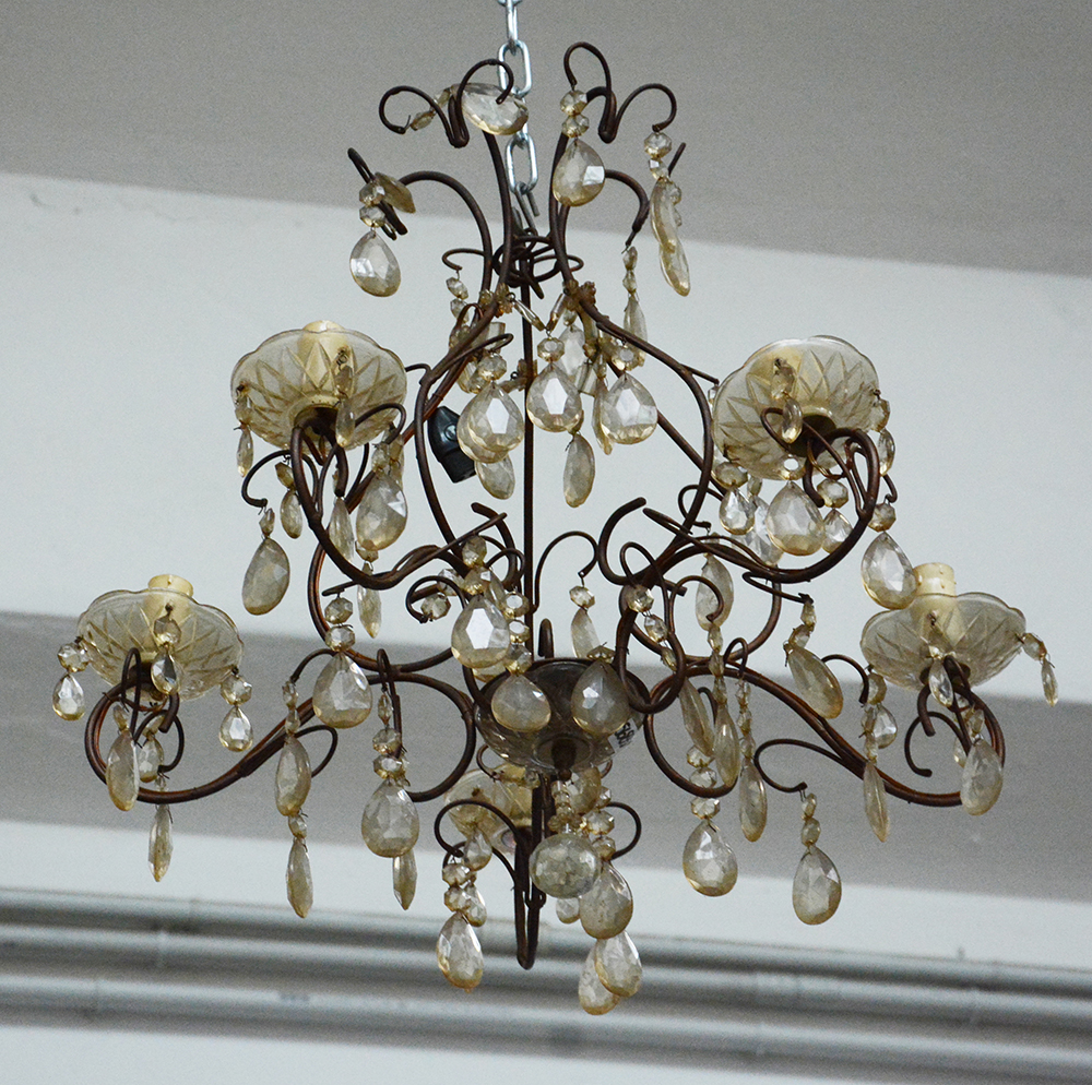 Lampadario a cinque luci con struttura in ferro ricurvo, piattini e pendagli in cristallo sfaccettato (difetti)