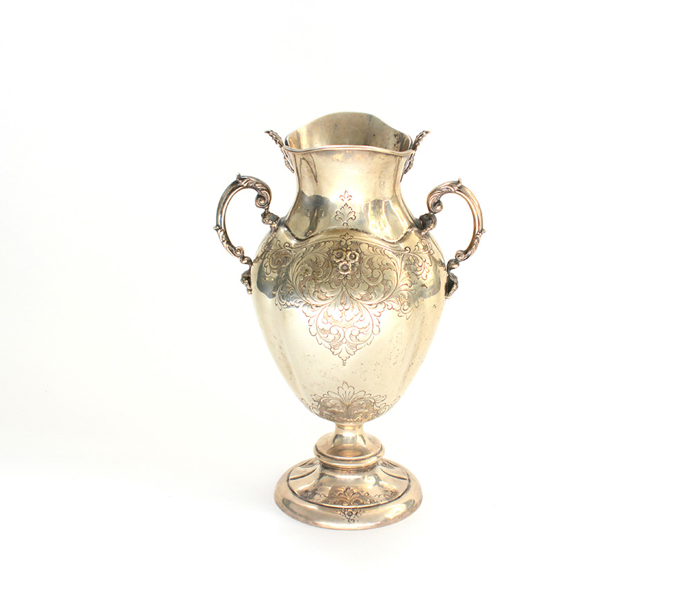 Vaso biansato in argento con corpo ovoidale baccellato decorato a motivi floreali. Italia, metà secolo XX (h. cm 31) (g 950 ca.)
