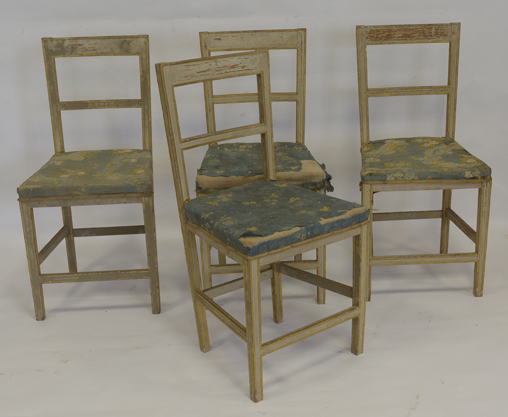 Gruppo di quattro sedie in legno laccato bianco con profili dorati e schienale a giorno. Secolo XIX (gravi difetti)