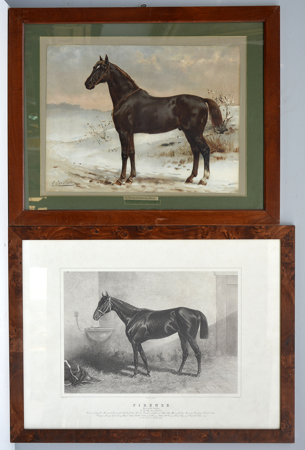Lotto di due riproduzioni a colori raffiguranti cavalli, misure differenti,...