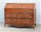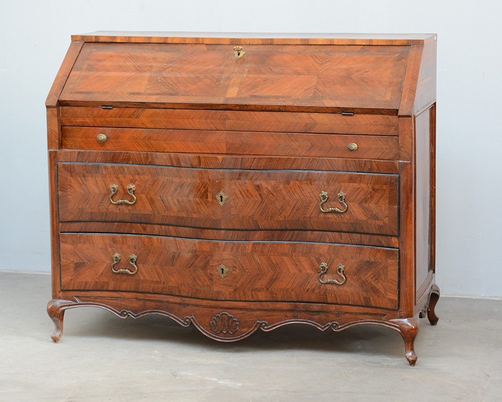 Ribalta in noce e radica di noce con fronte leggermente mosso a due cassetti grandi e uno più piccolo sotto la calatoia. Anta ribaltabile con cassettini interni, fianchi riquadrati e quattro piedini mossi (cm 125x103x58)