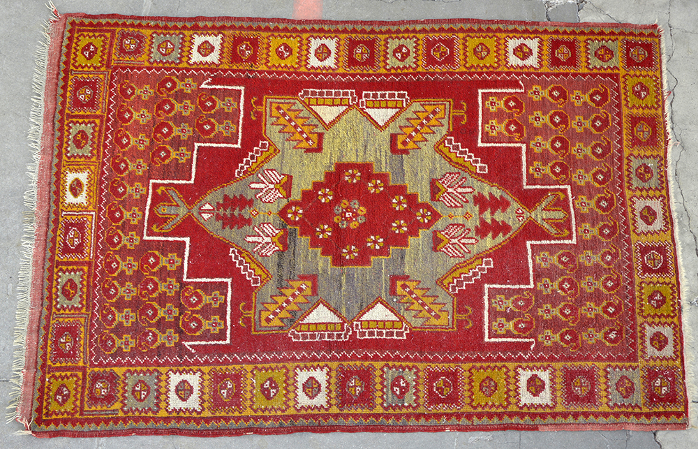 Tappeto Bergama, Anatolia secolo XX Disegno con medaglione a doppia nicchia verde su campo rosso (cm 156x106) (lievi difetti)