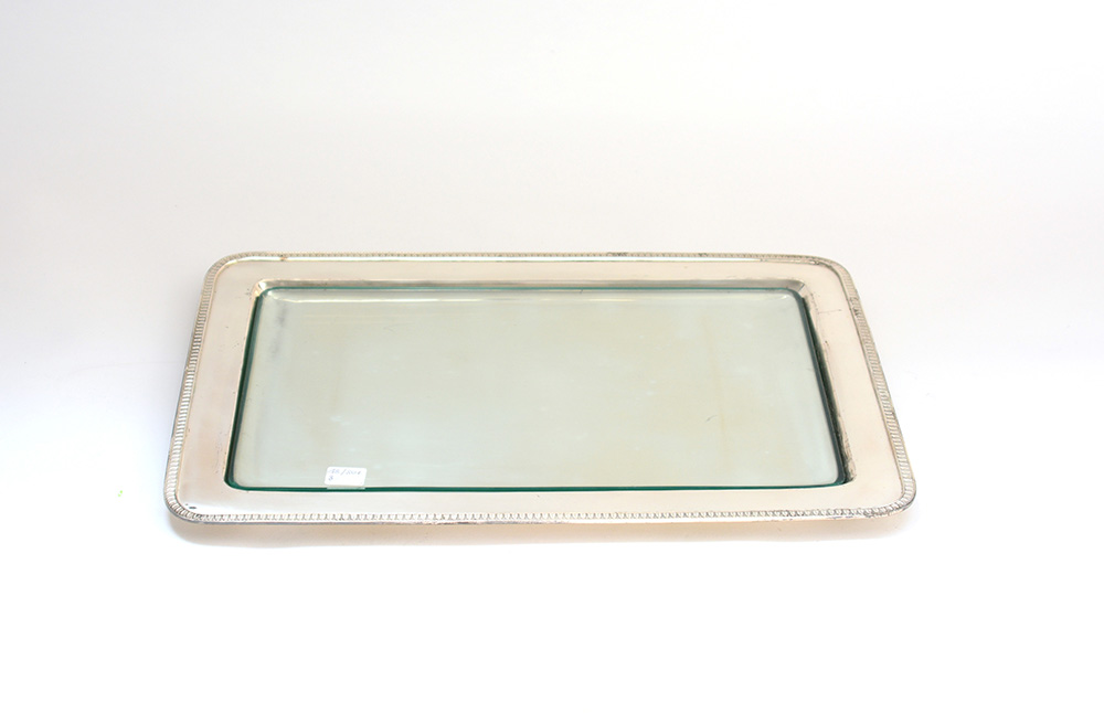 Vassoio in argento decorato a palmette con piatto in vetro. Italia metà secolo XX (cm 42x31.5) (g 1160 ca.)