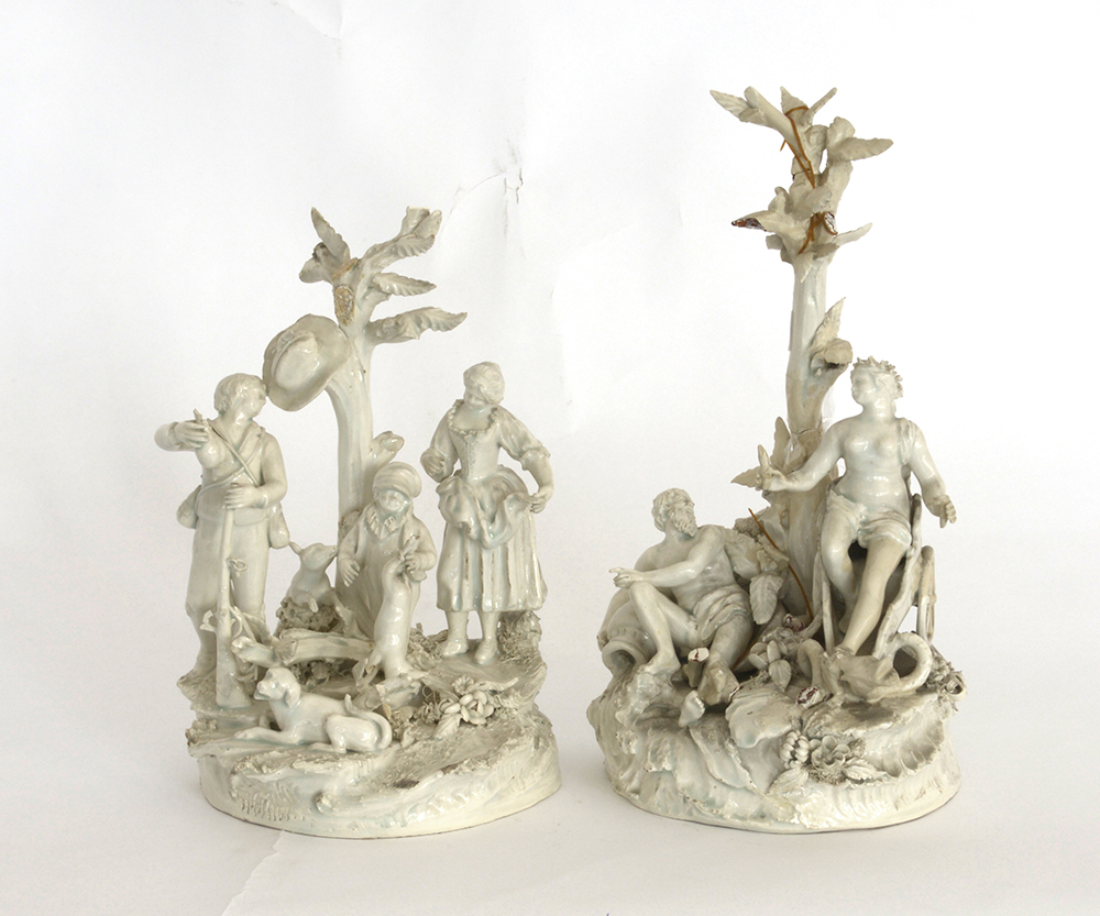 Lotto di due gruppi plastici in ceramica bianca raffiguranti una scena mitologia e di caccia (h max cm 29) (difetti, restauri e mancanze)