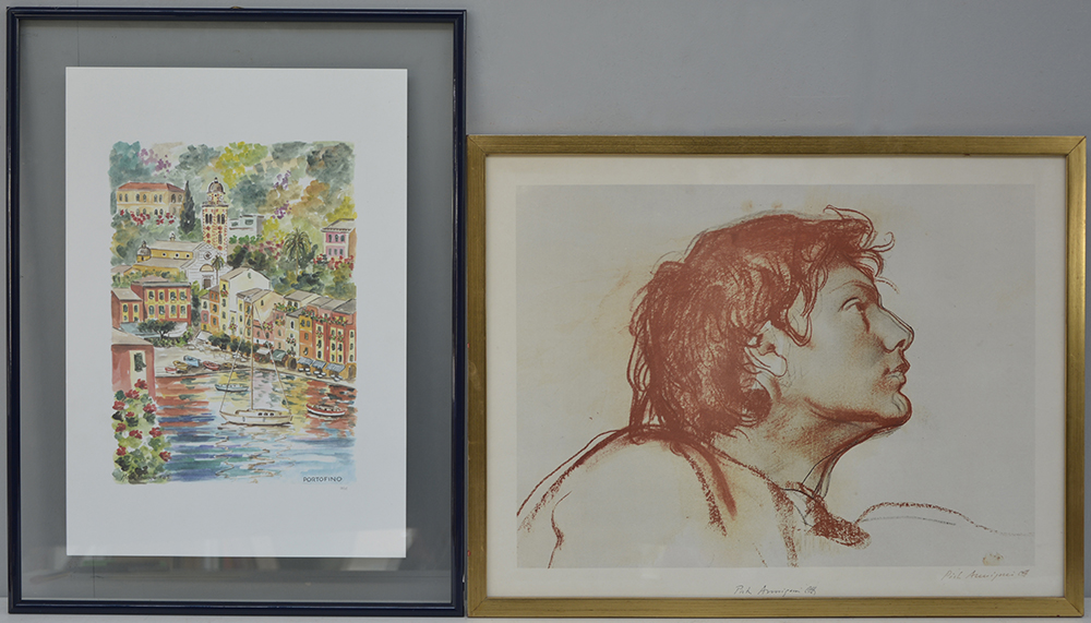 Lotto composto da una riproduzione di Pietro Annigoni con profilo maschile e una stampa con veduta di Portofino, misure differenti, in cornici (lievi difetti)
