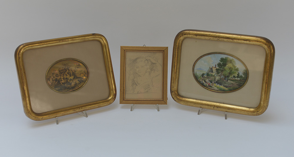 Lotto composto da una piccola ceramica ovale dipinta ed una incisa su metallo raffiguranti scene agresti, ed un disegno a matita raffigurante un fanciullo, in cornici (difetti)