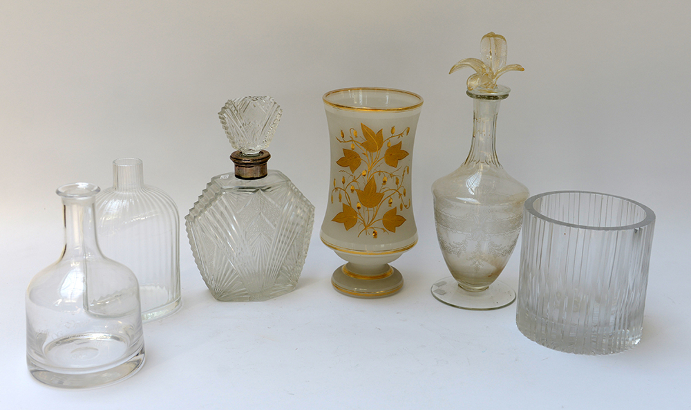Lotto composto da quattro bottiglie in vetro e due vasi, manifatture differenti (difetti)