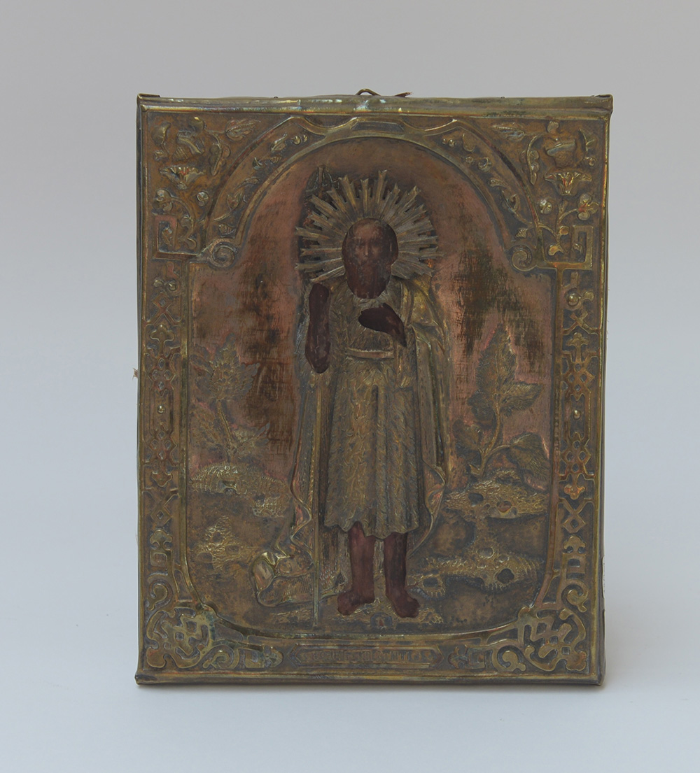 Piccola icona raffigurante un santo con riza in metallo argentato (cm 18x22) (difetti)