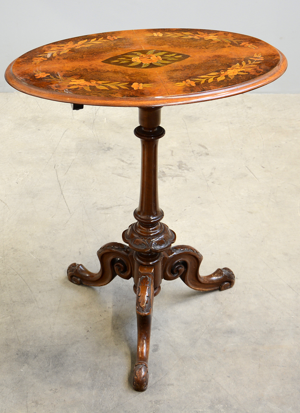 Lotto 1713 | Tavolino d'appoggio tripode con piano ovale intarsiato a motivi floreali (cm...