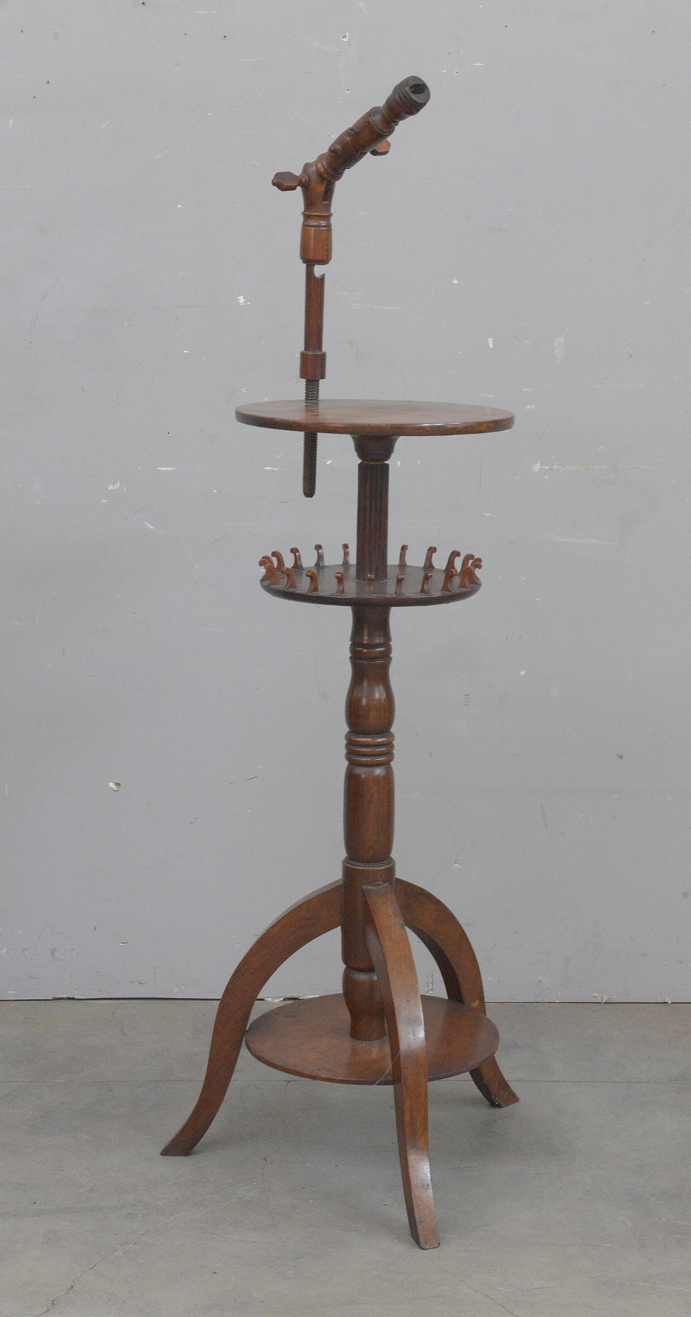 Tavolino da salotto tripode con tre ripiani tondi, quello superiore con applicato utensile snodabile (d cm 50, h cm 130) (lievi difetti)