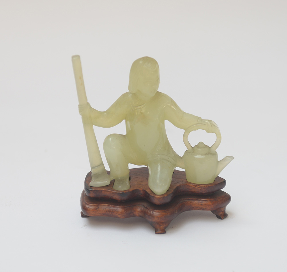 Scultura in pietra dura raffigurante contadino con teiera, base in legno (lievi difetti) Cina, sec. XX (h. 10 cm.)