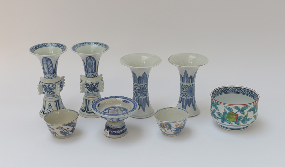 Lotto composto da quattro vasetti, due coppette, una ciotola e una alzatina in porcellana bianca e blu. Decori ed epoche diverse (difetti) Cina e Giappone