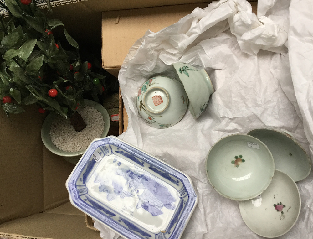 Uno scatolone contenente diversi oggetti di manifattura orientale tra cui potiche, vassoi, cuiscini, barattoli e ciotolline in porcellana, oggetti in vetro e in pietra dura e snuff bottle in osso. Decori e misure diverse (difetti)
