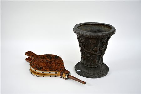 Lotto composto da un vaso in ghisa con decoro a foglie e un soffietto da camino