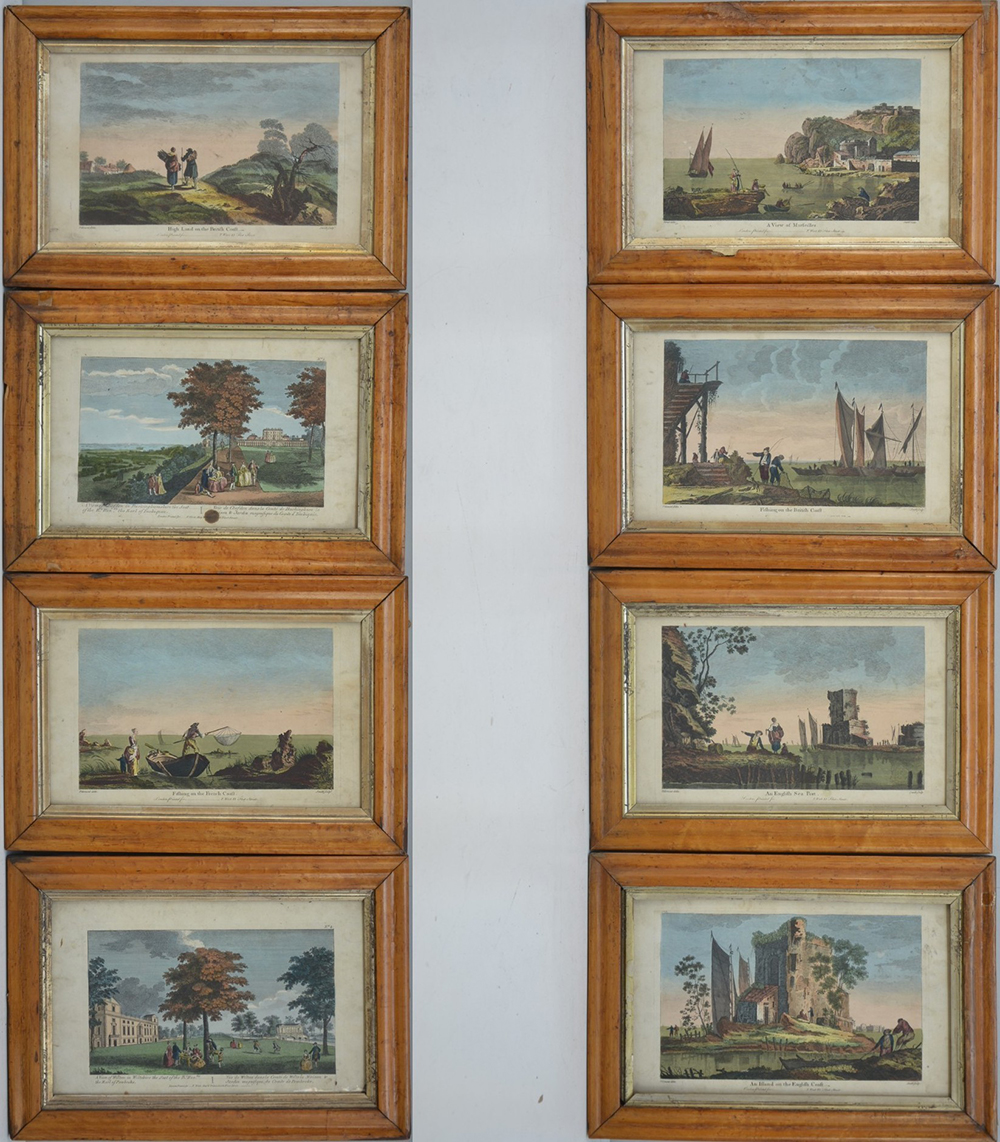 Gruppo di otto antiche incisioni inglesi a colori raffigurati paesaggi (fogli cm 21x34 circa), in cornici (difetti)