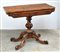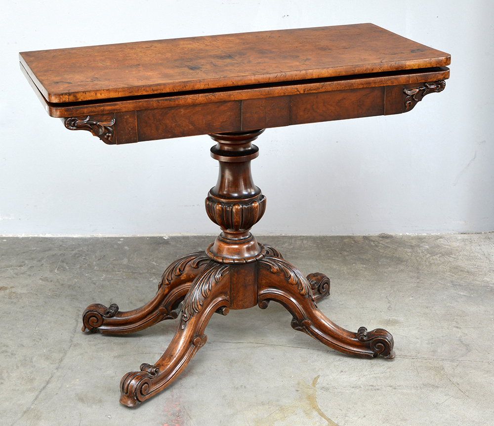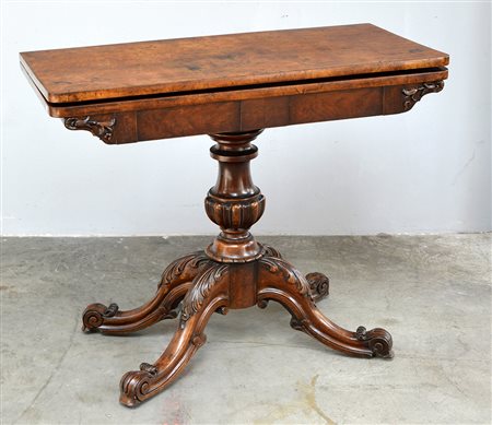 Tavolino da gioco lastronato in radica con piano apribile, gamba centrale tornita poggiante su quattro piedi sagomati e intagliati. Inghilterra sec. XIX (cm 93x75x46)