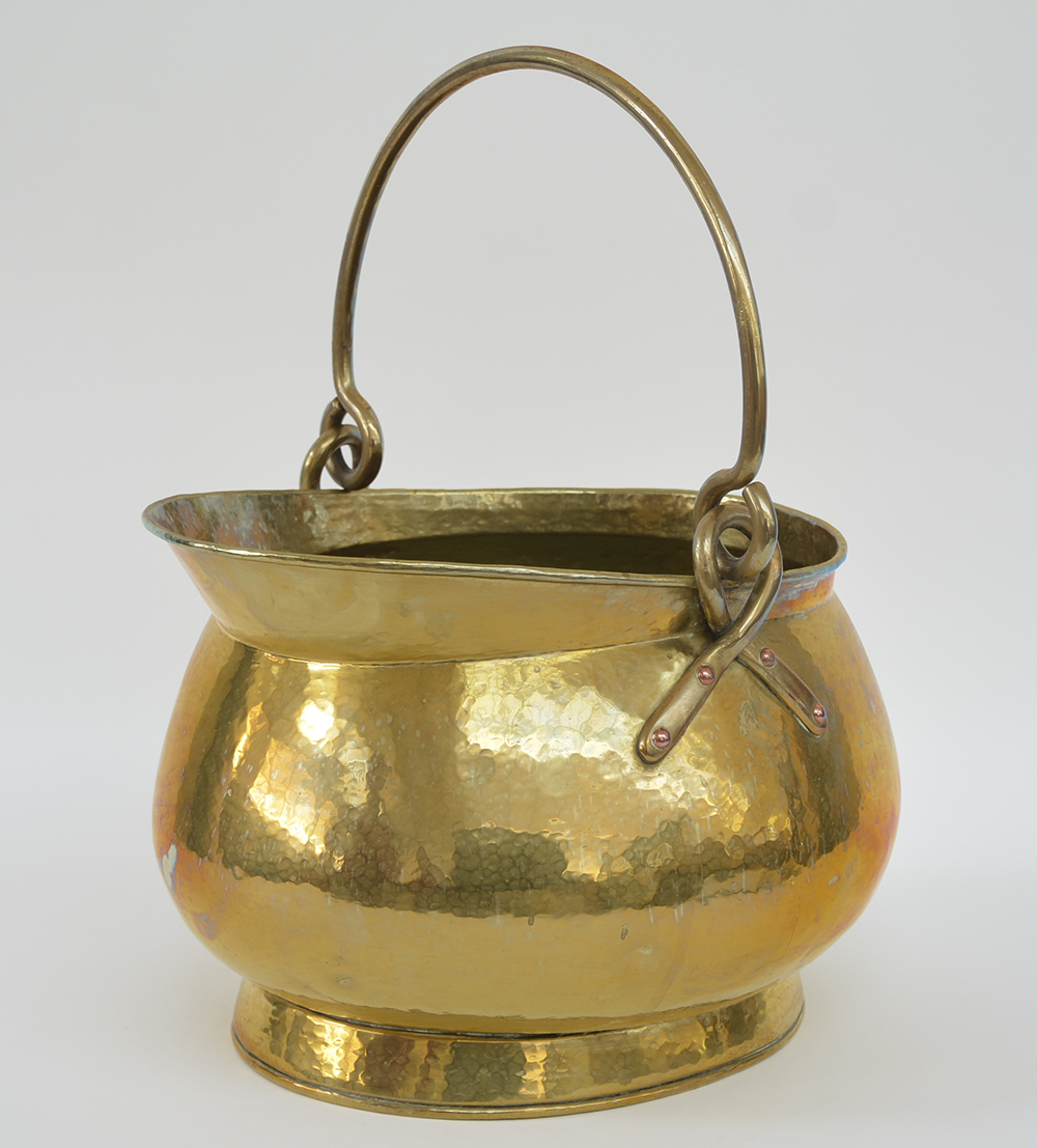 Cache pot in ottone martellato con manico e prese sagomate