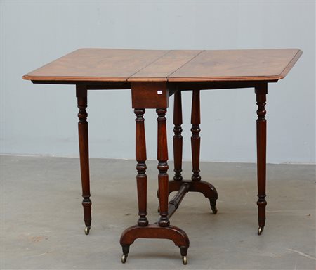 Tavolino ad alette lastronato in radica con gambe tornite poggianti su piedi sagomati muniti di rotelle. Fine sec. XIX (cm 84x71x16)
