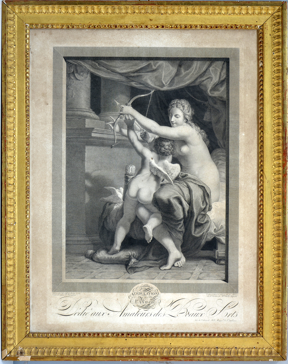 Incisione francese del secolo XIX, ''L'education de l'amour'' (cm 61x46) in cornice (difetti)