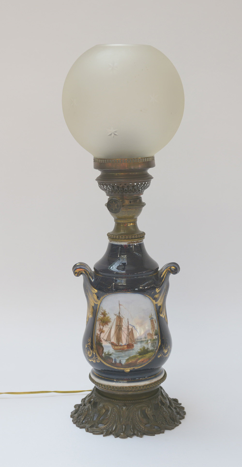 Lampada a petrolio in ceramica blu con paesaggi entro riserve, basamento in bronzo a volute e paralume in vetro satinato, montata a luce elettrica (h 53,5) (difetti)