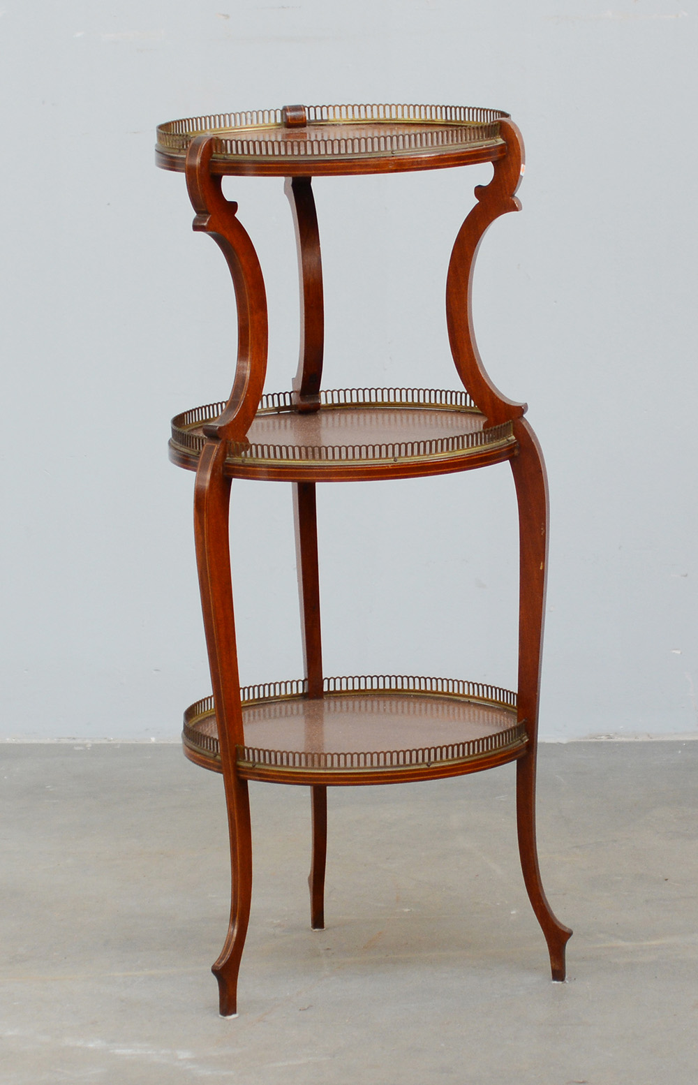 Etagere a tre ripiani in mogano filettato in legno chiaro, montanti sagomati e ringhierina traforata (h cm 87)(difetti)