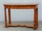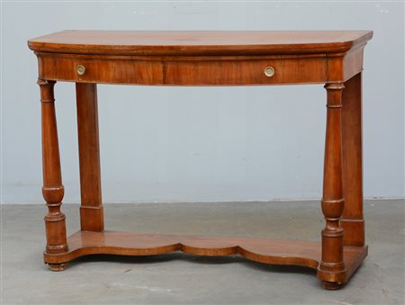 Consolle lastronata in noce con fronte curvo e cassetto nella fascia. Gambe anteriori tornite riunite da pianetto sagomato. Sec. XIX (cm 122x43x90)(difetti)