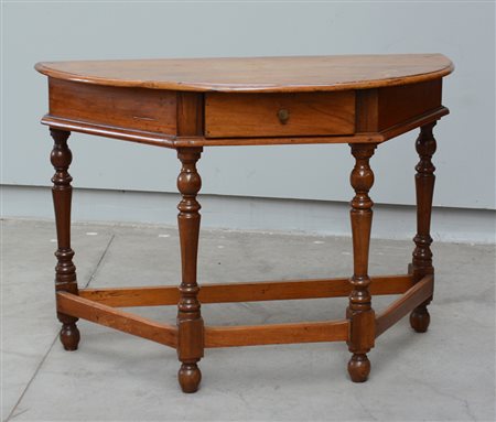 Antico tavolo da parete con struttura trapezoidale e piano a demi-lune, gambe tornite riunite da traverse (cm 113x79x56) (difetti)