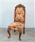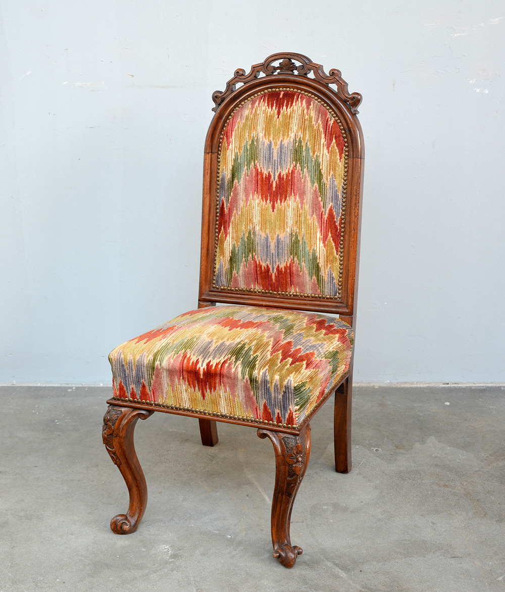 Sedia con schienale alto e cimasa intagliata e traforata. Gambe mosse decorate a motivi vegetali. Rivestita in tessuto fiammato