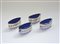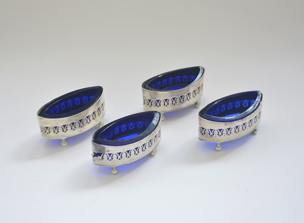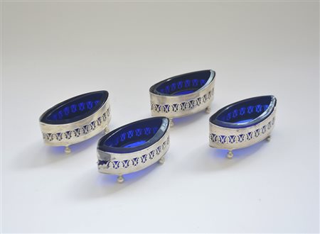 Gruppo di quattro saliere in argento con bordi traforati e contenitori in vetro blu. Secolo XIX (gr 175) (difetti e restauri)