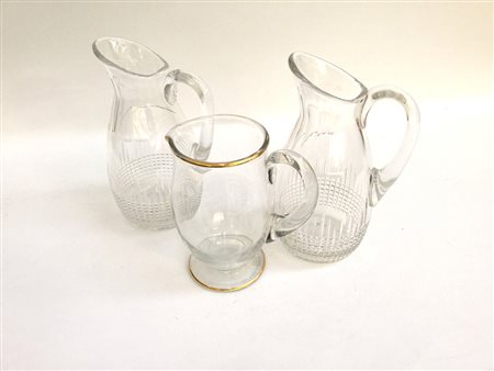 Manifattura di Baccarat. Lotto composto da una coppia di brocche in cristallo molato unite ad una con bordo dorato, marcate sotto la base