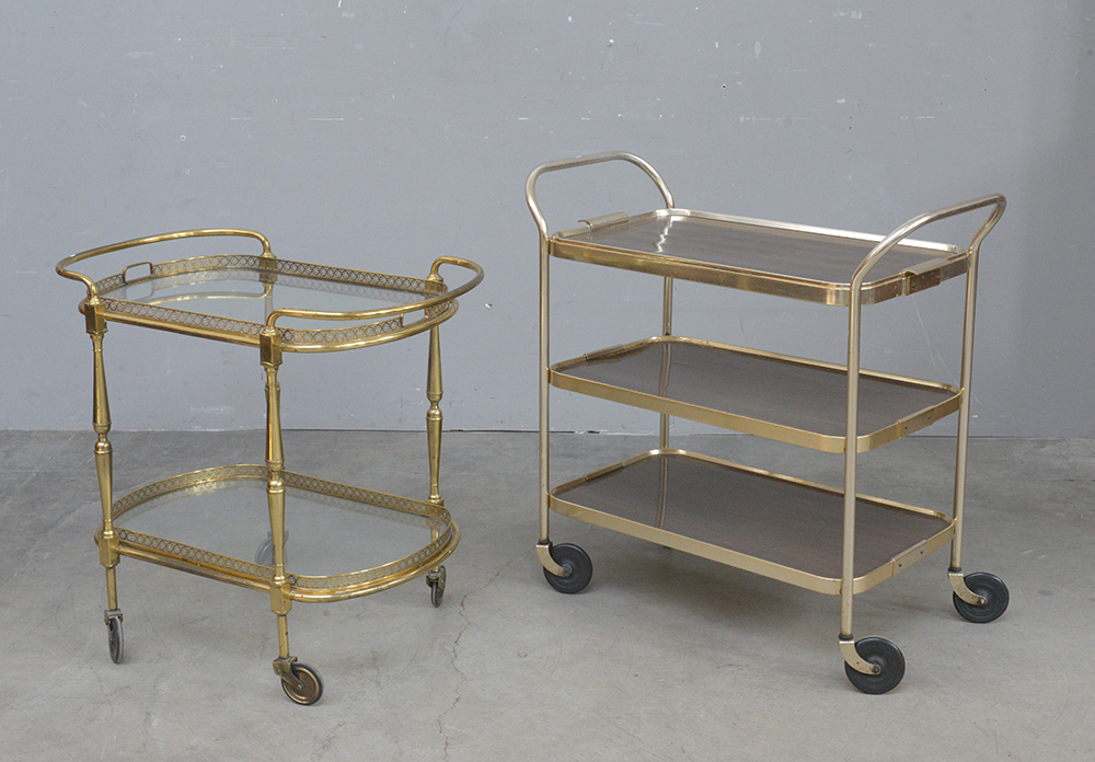 Lotto di due carrelli portavivande in metallo, legno e vetro (difetti)