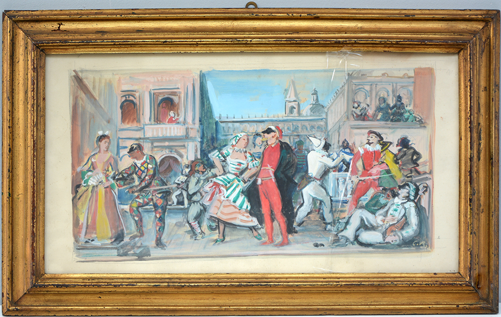 Ignoto, "Carnevale a Venezia" tecnica mista su cartone (cm 32x59) siglato in basso a destra, in cornice (difetti)