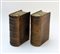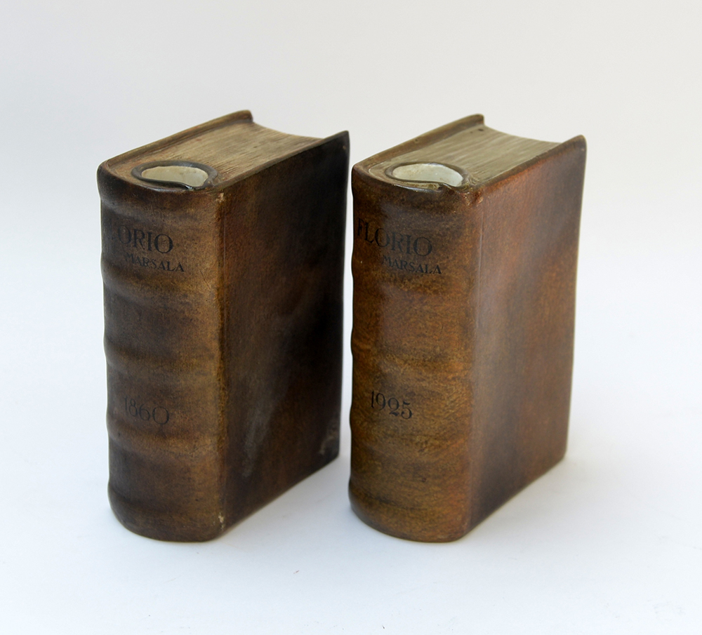 Manifattura italiana, secolo XX. Coppia di bottiglie in ceramica decorate a finti libri e inscritte "Florio Marsala 1860-1925" (difetti)
