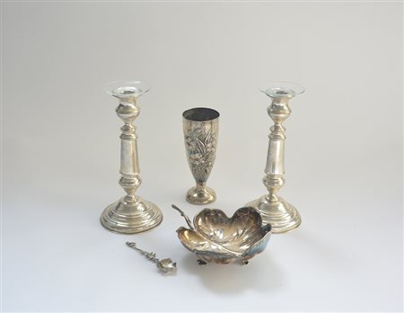 Lotto composto da un centrotavola a forma di foglia, un bicchiere a decoro liberty in rilievo, un cucchiaino decorato a tralci di vite e due candelieri a fusto tornito in argento (gr 220 senza i candelieri) (difetti)