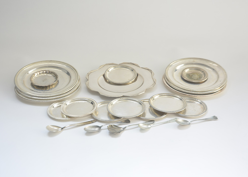 Lotto composto da sei sottopiatti, otto sottobottiglie, tre piattini e cinque cucchiaini di decori diversi (gr 1850 ca.)