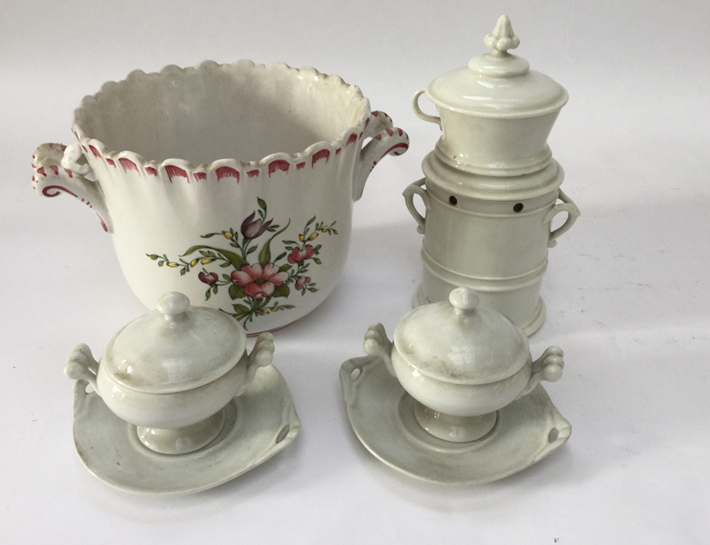 Lotto composto da un cachepot biansato, una villeus, e due cremierine con coperchio e vassoietto in ceramica bianca e policroma (difetti)