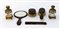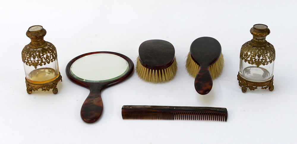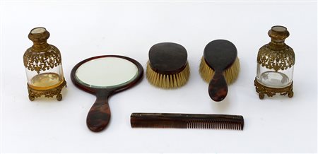 Lotto composto da due bottiglie in vetro e metallo dorato, uno specchio a mano, due spazzole e un pettine in finta tartaruga (difetti)