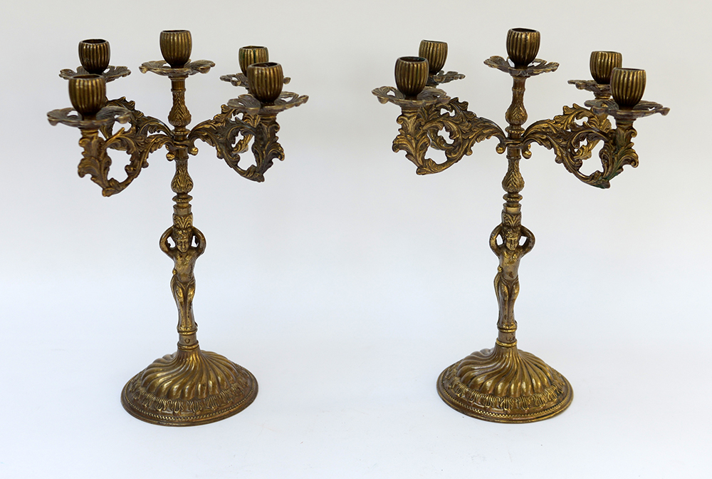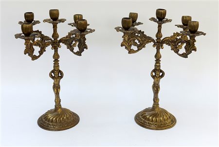 Coppia di candelieri in metallo a cinque fiamme (h. cm 38)