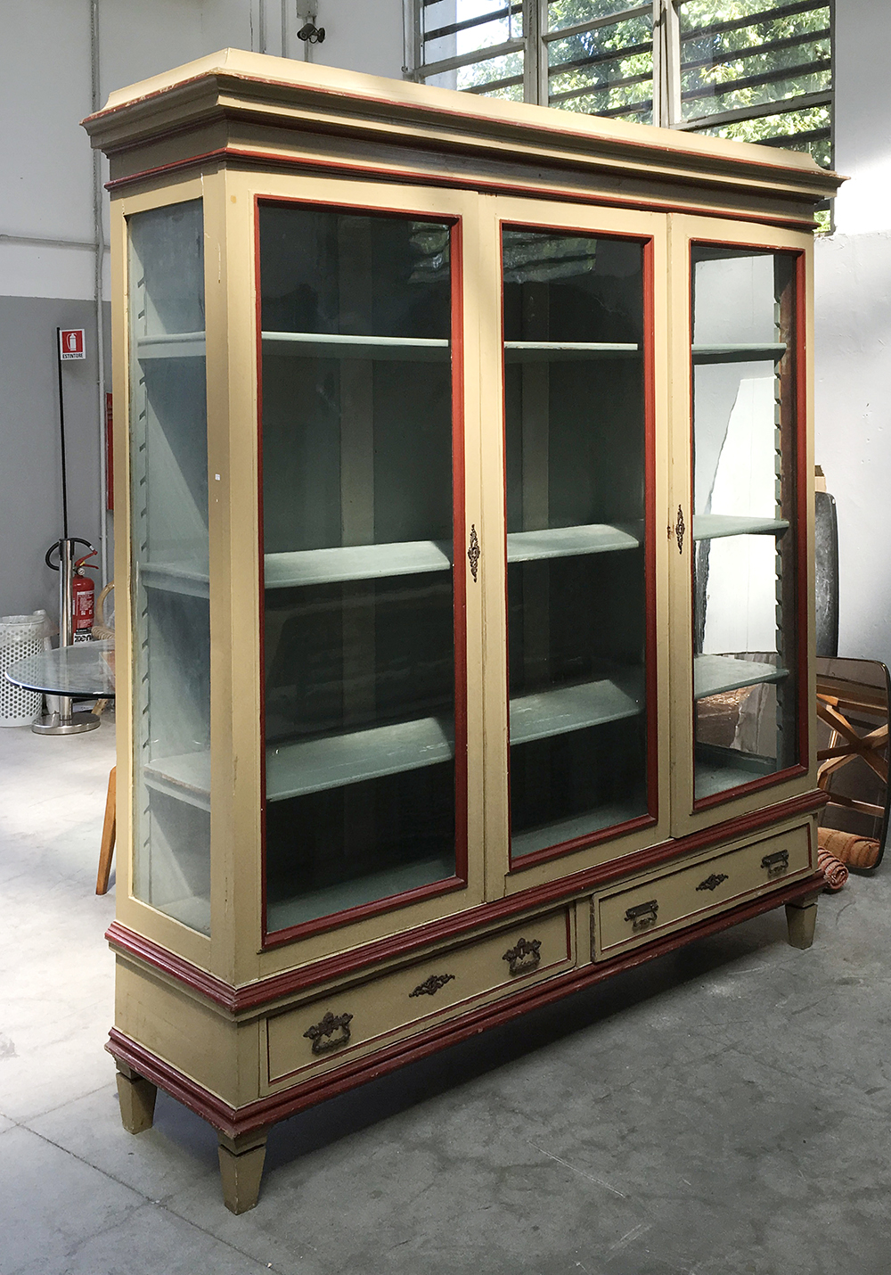 Vetrina a due ante in legno laccato avorio con profili bordeaux, due cassetti...
