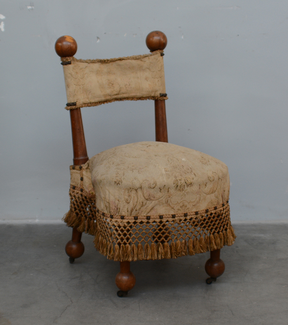 Poltroncina in legno massello con gambe e schienale torniti e seduta e schienale rivestiti in tessuto beige con frangia. Italia, fine secolo XIX/inizio secolo XX. (cm 47x84x54) (lievi difetti)