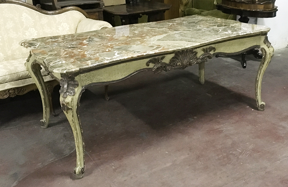 Tavolo da centro di forma sagomata in legno laccato avorio decorato da profili e fregi intagliati a conchiglie stilizzate e motivi vegetali dorato a mecca, piedi a ricciolo, secolo XIX, piano in marmo venato di epoca posteriore (cm 190x80x108)(difetti)