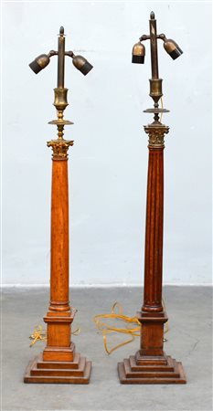 Coppia di abat jour in rovere con colonna scanalata e capitello dorato (h. cm...